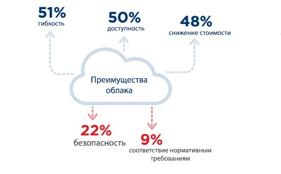 Кроме того, участники опроса назвали преимущества и недостатки облака. Основные «бенефиты», по мнению большинства, достигаются за счет обеспечения гибкости, доступности и снижения расходов. Минусы же видятся в недостаточности обеспечения вопросов безопасности (так считает 22 % опрошенных) и неполном соответствии нормативным требованиям (9 % голосов).