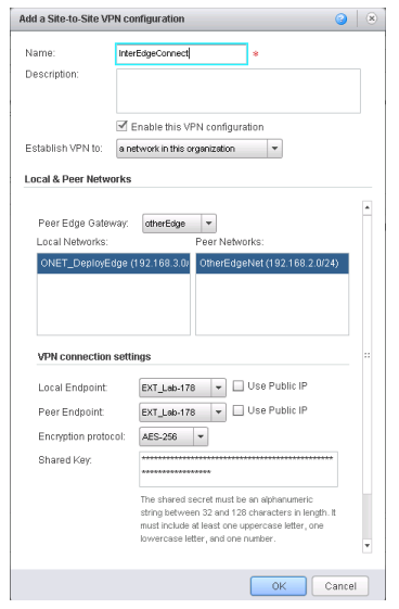 Помимо кейса с site-to-site VPN между двумя удаленными площадками возможен вариант подключения к другим сетям в рамках одной организации. Для этого требуется развертывание двух Edge, где каждый будет связан с соответствующей подсетью. Чтобы создать VPN-подключение, выполняют следующие действия: переходим в закладку Edge Gateway services -> Add и в поле Establish VPN to указываем значение a network in this organization.