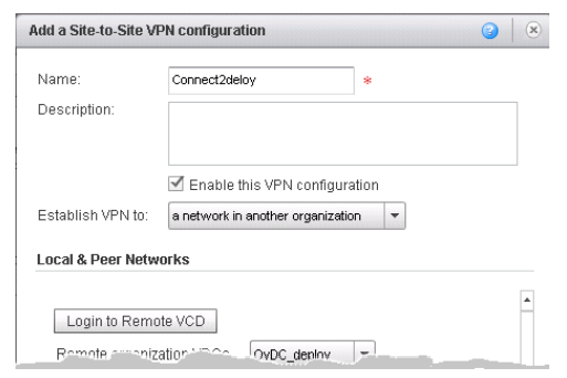 В открывшемся окне мастера вводим название подключения, а в поле Establish VPN to определяем сеть другой организации. Тем самым становится понятно, что в случае установки VPN-соединения происходит подключение к сети другой организации. После чего нажимаем Login to Remote vDC и открывается окно: