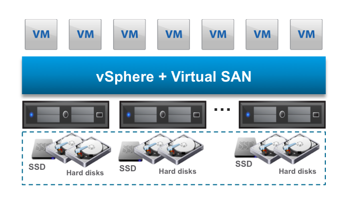 vSAN использует диски сервера для создания виртуального хранилища, которое доступно всем узлам кластера vSphere. Программно это работает на том же гипервизоре, что и сама платформа виртуализации, параллельно с вычислительной частью. Соответственно, на сервере одновременно работает и виртуальная СХД и виртуальные серверы – конвергенция. Для отказоустойчивости, необходимы несколько узлов, диски которых создадут единое пространство хранения доступные даже в случае аварии на одном из серверов. Теперь подробнее.